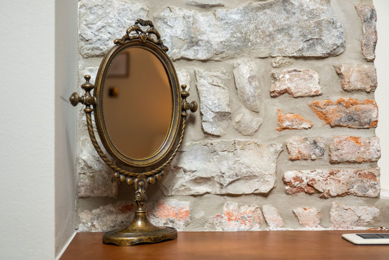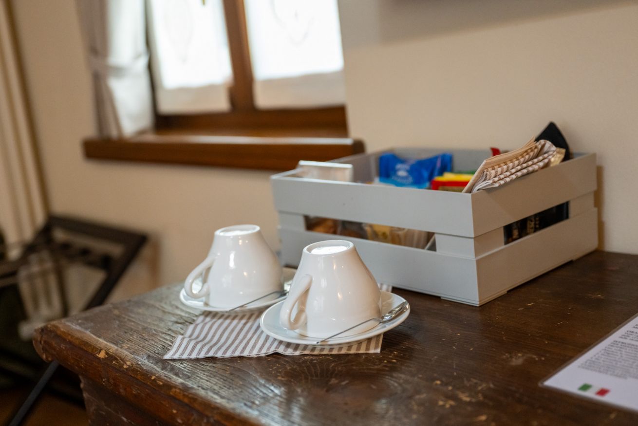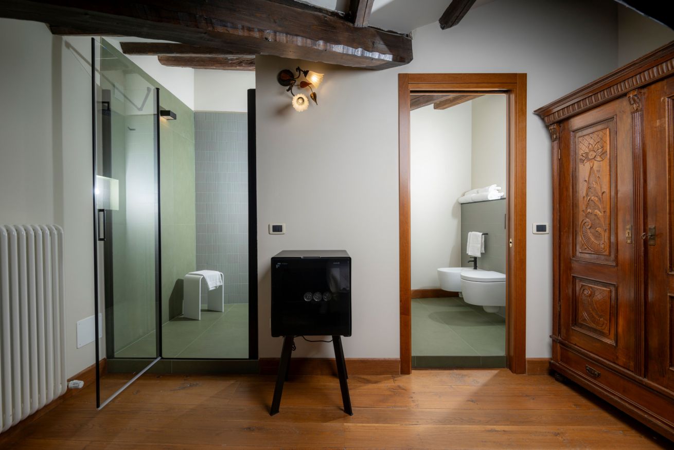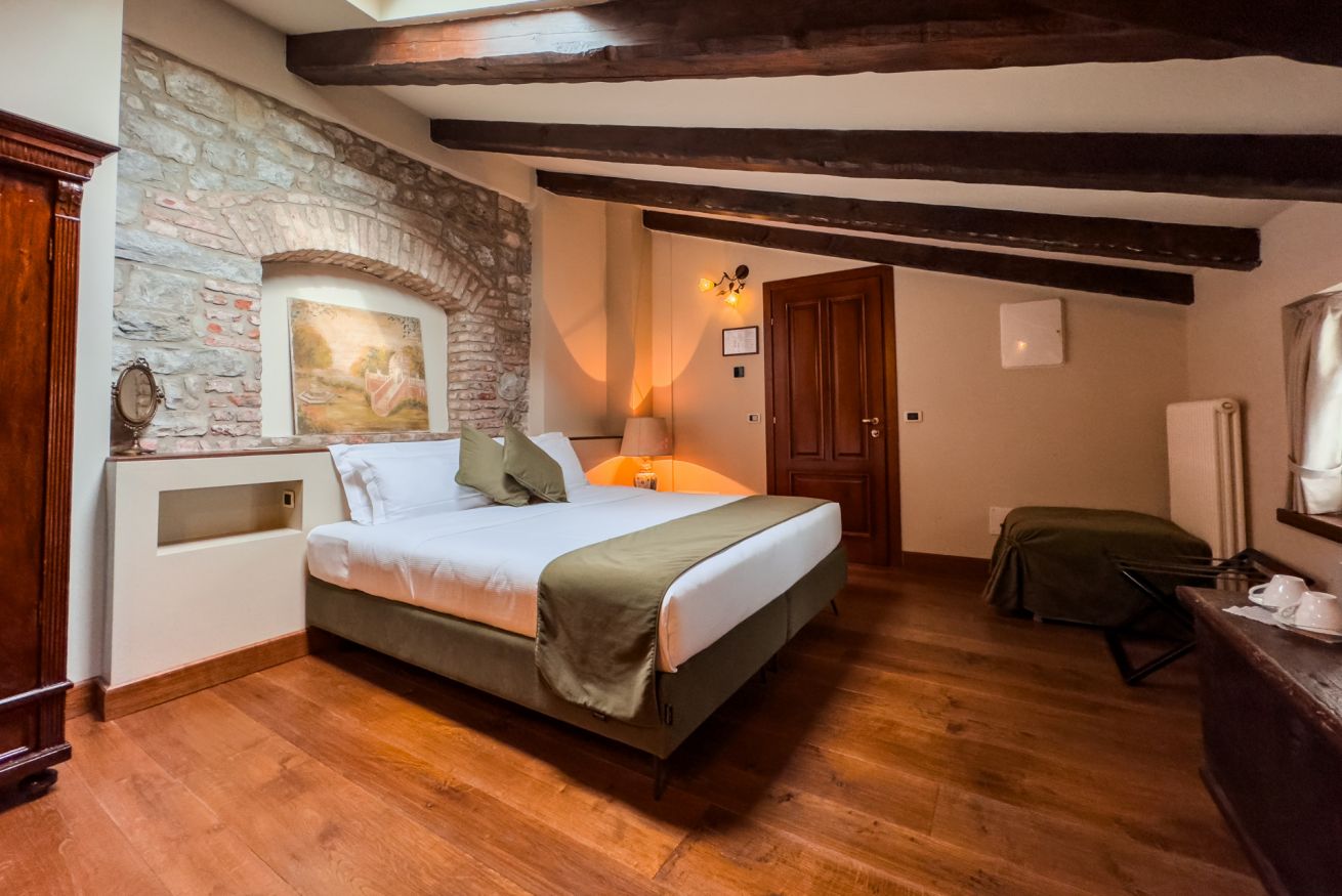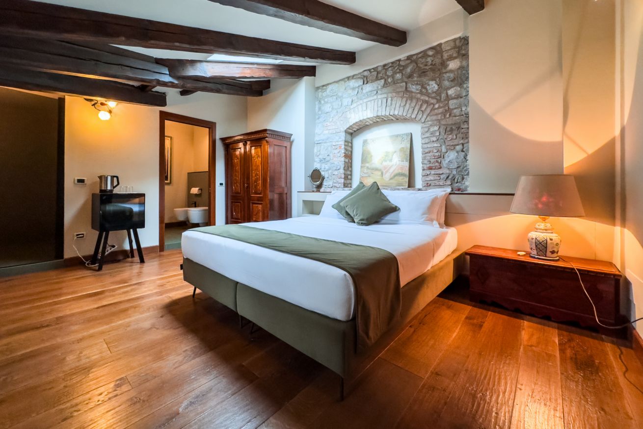 La suite Tecla (26 mq), con una spettacolare vista sul Ponte del Diavolo, è un rifugio tranquillo e affascinante, dove comfort e stile si fondono. Cassettiere e armadi con dettagli intagliati e finiture in legno aggiungono un tocco di eleganza e storia alla camera.